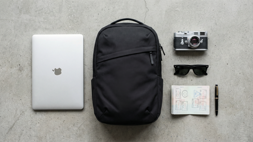Prompt: Next to a black minimalist backpack, the following items are arranged neatly in a grid: a silver laptop, a vintage film camera, black sunglasses, a passport, and a fountain pen.