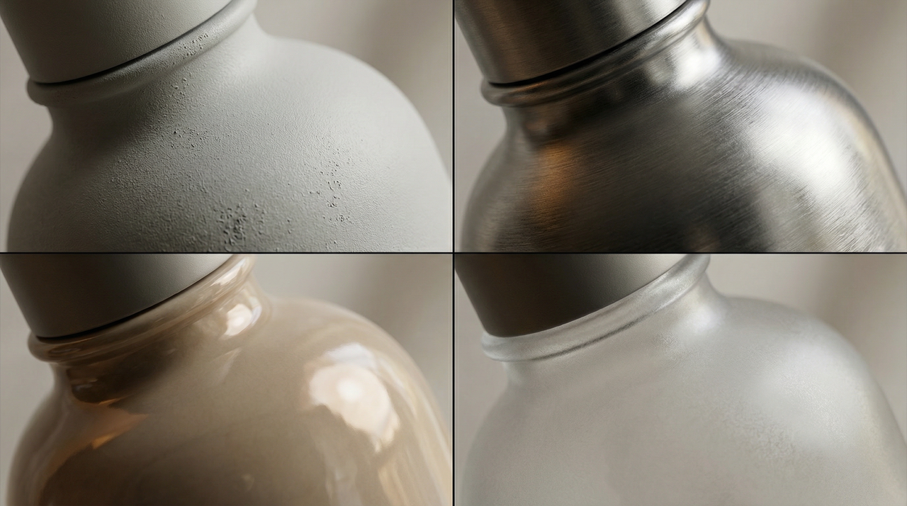 Prompt: A 2x2 grid collage. Each cell is an extreme macro close-up of the same part of the bottle (e.g., the bottle shoulder).