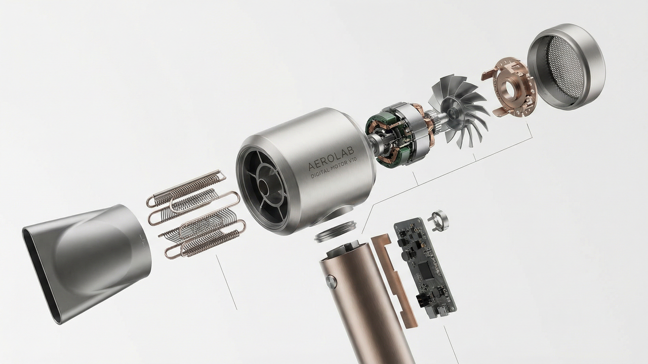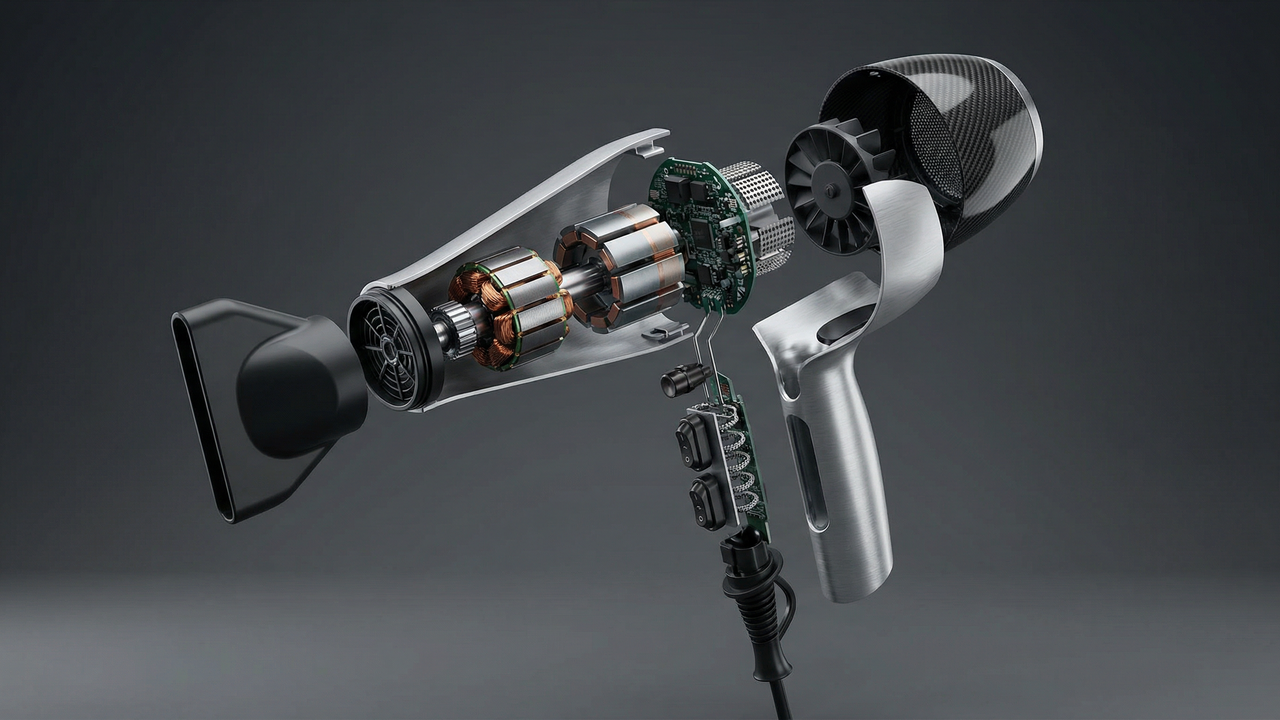 Prompt: A professional 3D exploded view of a high-tech hairdryer suspended in mid-air, revealing the internal high-speed motor, copper coils, and circuit chips.