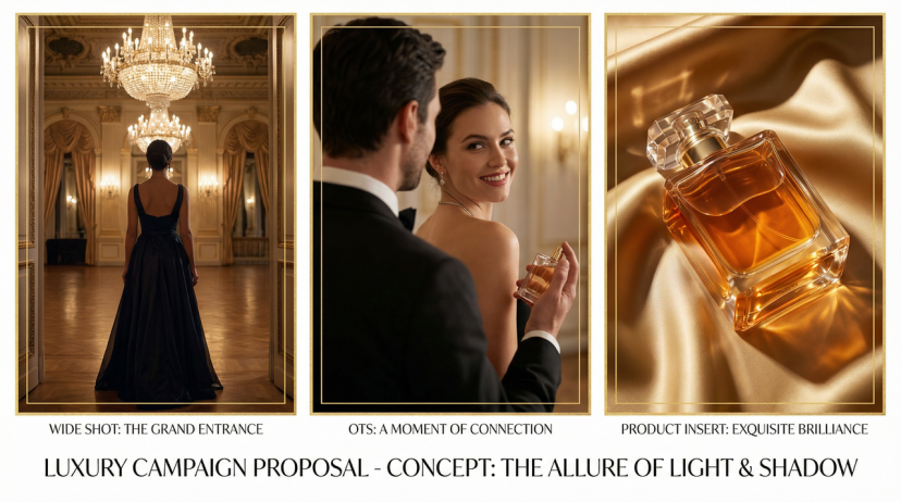3. **Product Insert:** A close-up of the perfume bottle on silk, with light penetrating the glass to form caustics, looking extremely luxurious (product showcase).