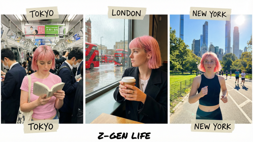 Prompt: A Gen Z Western woman with short pink hair and cute freckles on her face. Clearly captured by an iPhone 15 Pro Max. Scene Collage: The frame is divided into three parts or shows three scenes: Left reading a book in a busy Tokyo subway, Middle holding a coffee in a rainy London cafe, Right jogging in the sunlight in New York's Central Park.