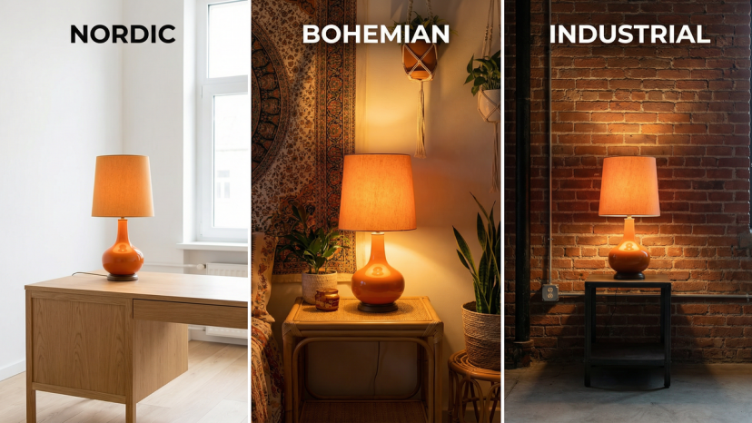 2. Middle (Bohemian):The background features tapestries and greenery, the lamp is on a rattan table, and the lighting is warm and lazy.