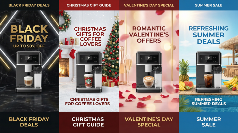 Prompt: A coffee machine, comprised of four vertical strip slices stitched side-by-side. From left to right: the dark and cool Black Friday -> the snowy warmth of Christmas -> the pink romance of Valentine's Day -> the refreshing brightness of Summer. The product is located at the center of each slice, as if it is traversing through four different space-times.