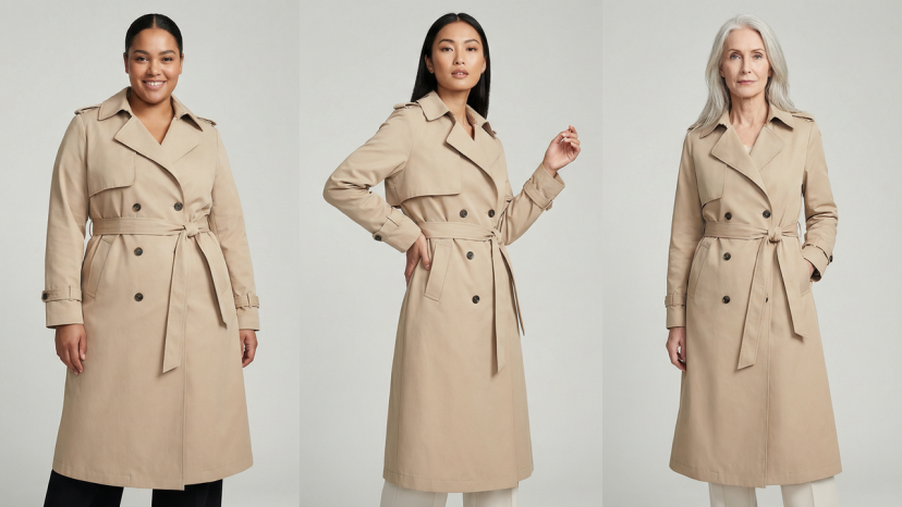 Prompt: Three different models standing side-by-side or staggered, wearing identical "minimalist beige trench coats". Character Details: On the left is a confident plus-size model (US market), in the middle is an elegant Southeast Asian woman (APAC market), and on the right is a stylish silver-haired woman (senior market). Style: High-fashion Lookbook style, solid color background (such as light gray or white), even soft lighting.