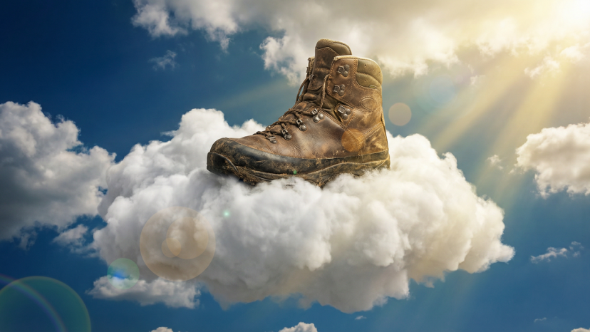 Prompt: A sturdy hiking boot is stepping on a fluffy, white cloud. Background: Azure blue sky, sunlight piercing through the clouds. Style: Surrealism, dreamlike but the product itself must be realistic and clear.