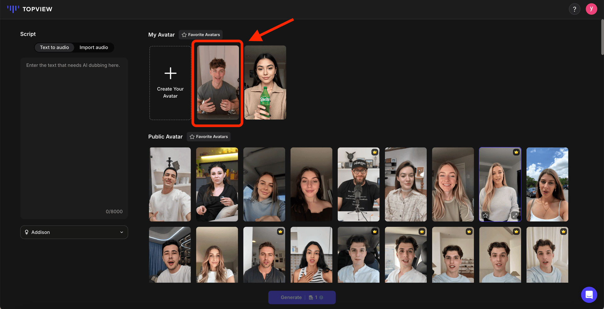 The cloned avatar will be added to your avatar library, making it easy to access when using Topview’s tools, such as the Materials to Video feature.